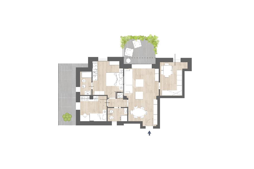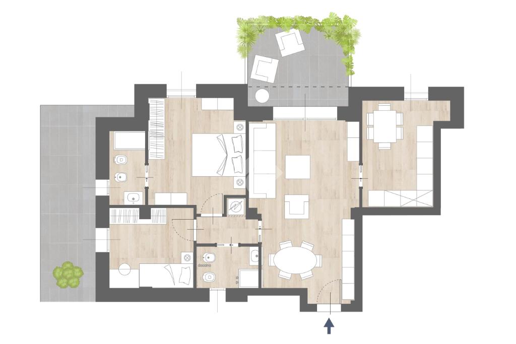 L'appartamento comprende due camere da letto, un ampio soggiorno con cucina abitabile, perfetta per chi ama cucinare; due bagni completano la zona notte, garantendo comfort e praticità.