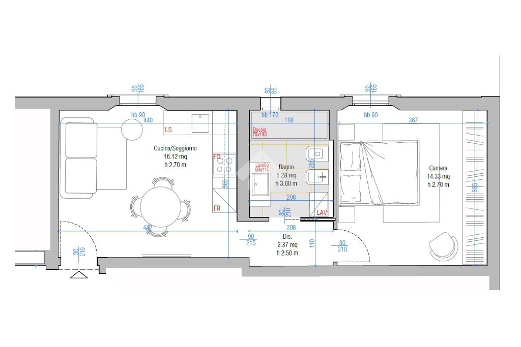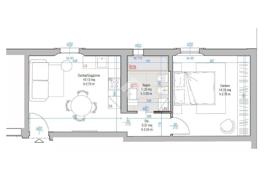 La disposizione interna prevede soggiorno con angolo cottura, camera da letto e bagno pensati per ottimizzare lo spazio e la funzionalità.